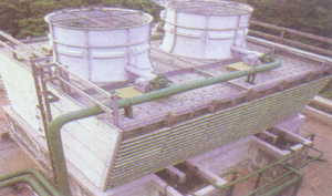 本系列采用两侧进风,靠顶部的风机,使空气经由两侧的填料,与热水进行质交换,湿热空气再排向塔外,填料采用两侧有凸点,避免了水滴直接滴下的机会,提高了形成水膜的作用,填料尾部设有收水装置。