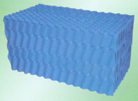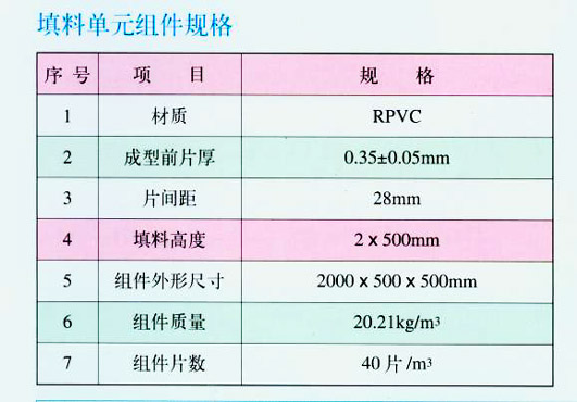 折波改进型为点滴薄膜式填料。其片型在折波填料基础上增加了数条与水平夹角呈60°的梯形余波纹,纵向有等距离上下交替对称排列的加强筋,片距采用椭圆锥形台凸台和凹槽粘结固定。和折波填料比较,提高了气水扰流,减缓了水膜下泄速度,增大了填料比表面积,延长了水、气热交换的时间,提高了填料散热性能,减少了进风阻力。